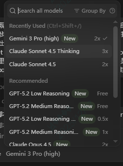 再拉开模型的菜单,里面集成了目前最先进的海外模型,比如最近的Gemini 3 pro,你可以切换选择claude或者GPT等。这一个月20美金的性价比还是杠杠的,太香了。