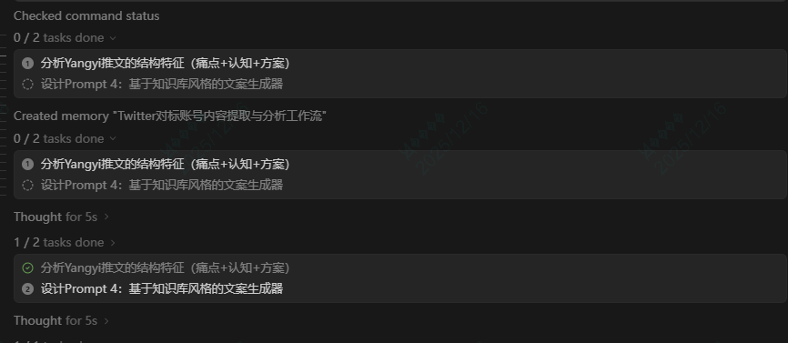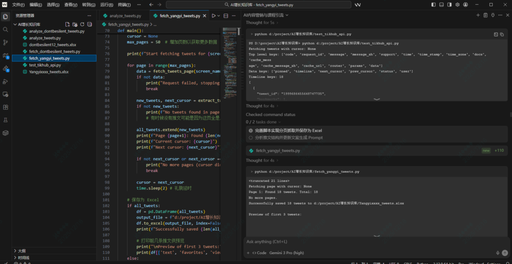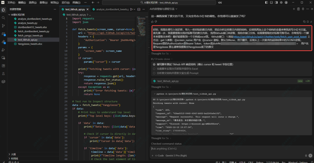今天突发奇想,能不能用编程工具来实现这个需求? 也就是我通过编程工具,完成一整条流程(提取数据、分析文案、提炼框架、生成文案)。毕竟现在编程工具里都有AI能力,简单的需求不需要你自己写代码。