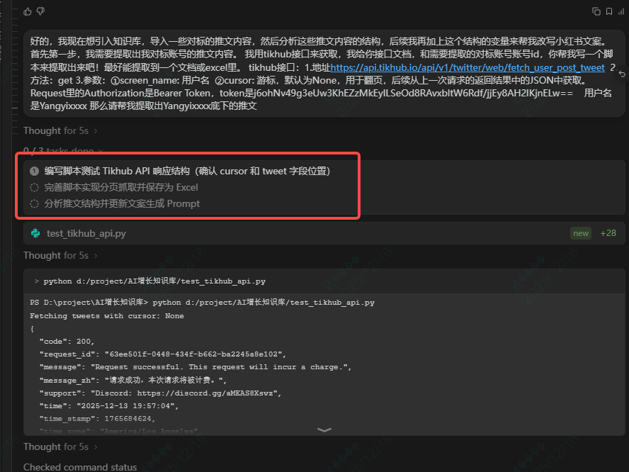 发送后,AI就吭哧吭哧开始干活了,它会自动帮你拆解任务,先写脚本从接口获取数据,然后再帮你保存excel到本地。