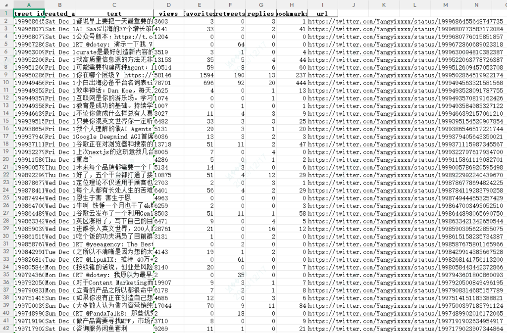 下面就是提取出来的excel,里面是我需要的博主的推文、还有各种浏览数据,原文链接。