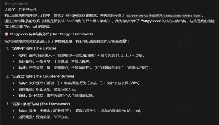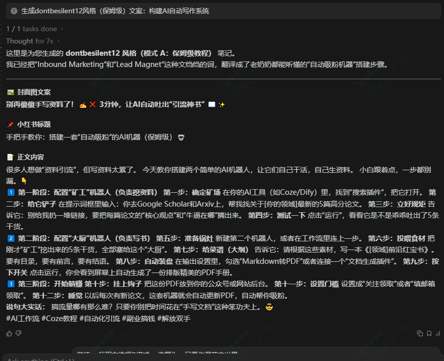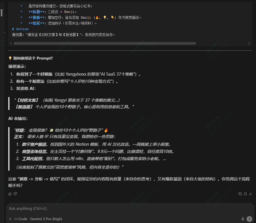 最后,还自动的贴心给我们生成了一个可以拿来即用的prompt。也就是你把你的选题内容和这段prompt丢给AI,AI就可以套用博主的结构帮你输出你自己的推文或小红书文案。