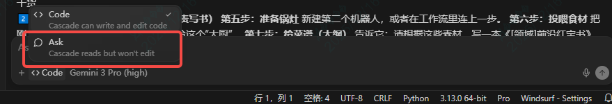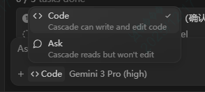 有两种模式①code:需要写代码的时候,就选择code模式 ②ask:会话模式,只和AI对话,它不会帮你写代码。