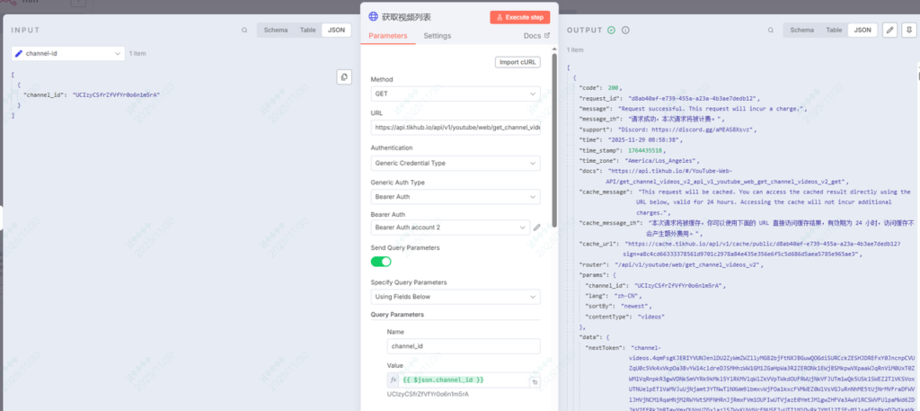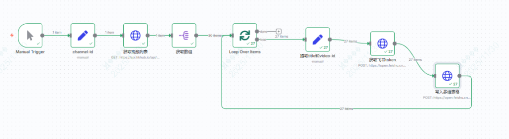 我们可以搭一个n8n流程,来通过频道id获取底下的视频id和标题并写入到多维表格里