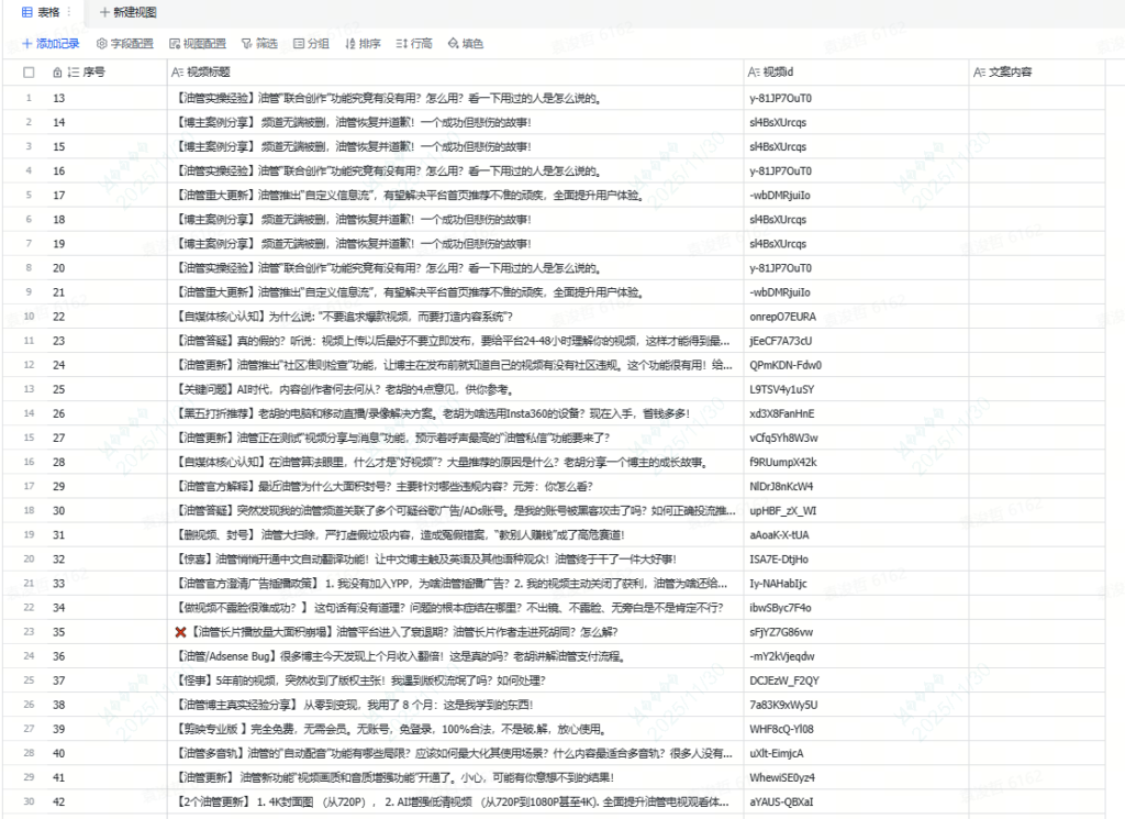 执行节点后,我们就把视频的标题和id值,成功写入到多维表格中了。