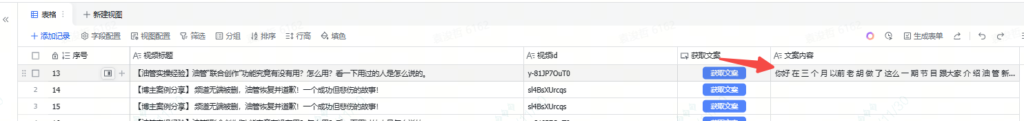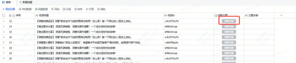我们在多维表格加多一列按钮字段,点击按钮,就获取对应行的视频的视频文案