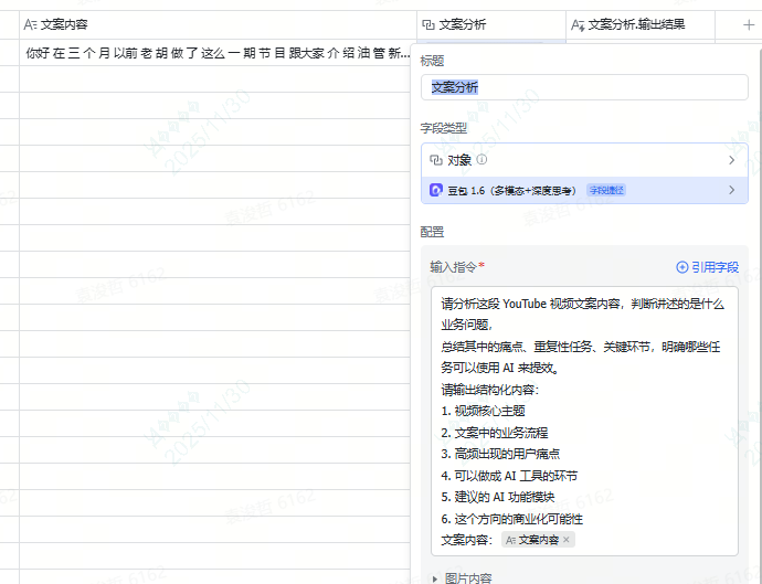 飞书多维表自带 AI 能力,我们可以创建一个“AI 字段”,让它自动分析“文案内容”。