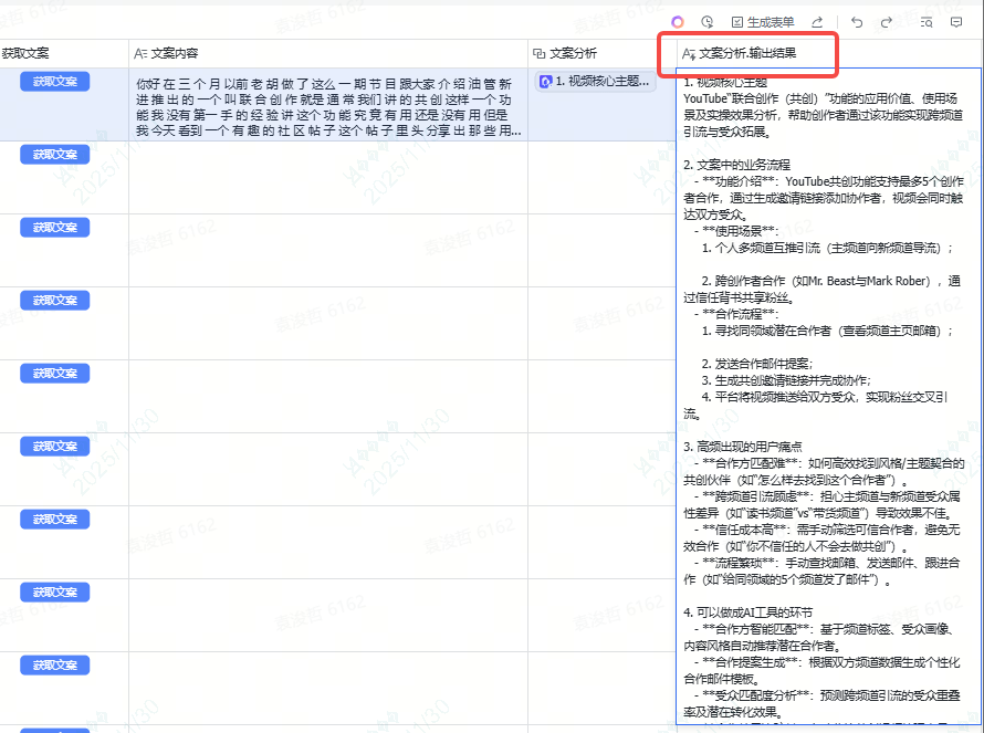 这样,每当新的文案写入表格,你都会看到 AI 自动生成: