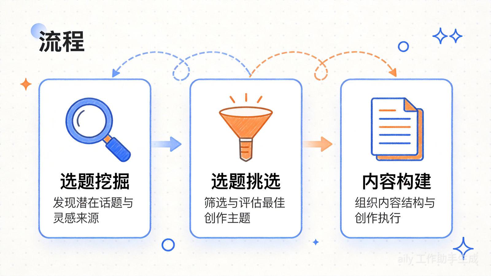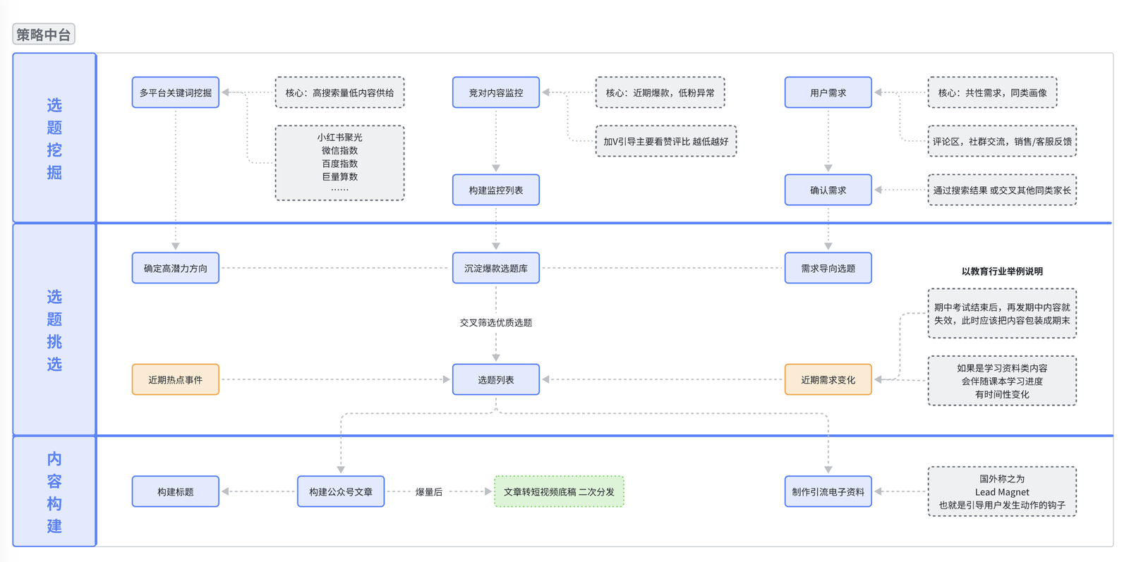 整张图可以看成三个大阶段:选题挖掘 → 选题挑选 → 内容构建。前两个阶段解决「写什么」,最后一个阶段解决「怎么写、怎么发、怎么引流」。