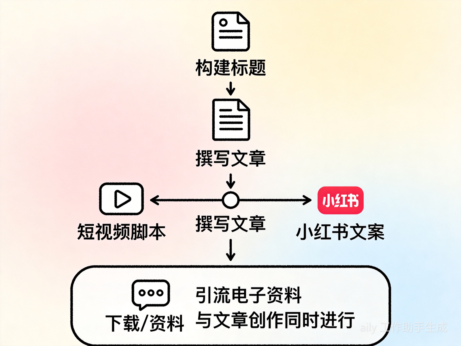 (1)构建标题 → 写公众号文章 → 爆量后 转短视频底稿做二次分发;同时可以做引流电子资料(Lead Magnet),引导用户发生动作。