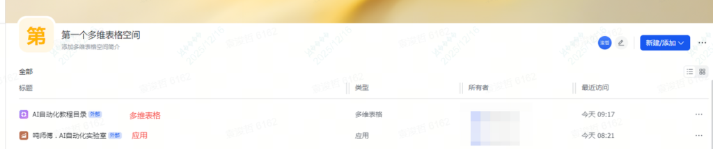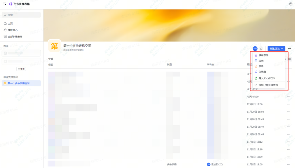 首先,我们要在这个空间里,把我们所需的多维表格或者表单之类的信息新建,或者同步过来