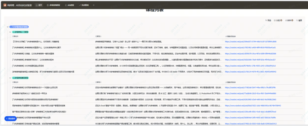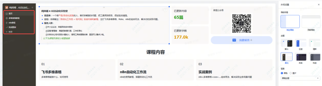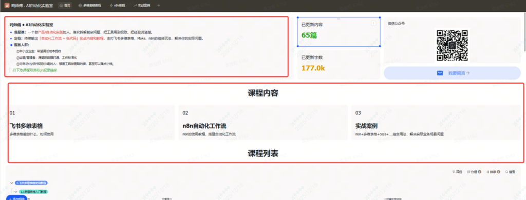 因为平时会写一些多维表格、n8n工作流以及实战案例的课程放在小报童,但是总感觉很散,所以一直想做一个页面,把这些课程的介绍和列表聚合起来,用户看起来也方便