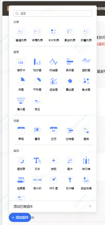 这个组件列表是不是看着有些眼熟,是的,和多维表格里仪表盘的组件类似,当然应用模式这里会相对丰富一点,尤其是列表组件。