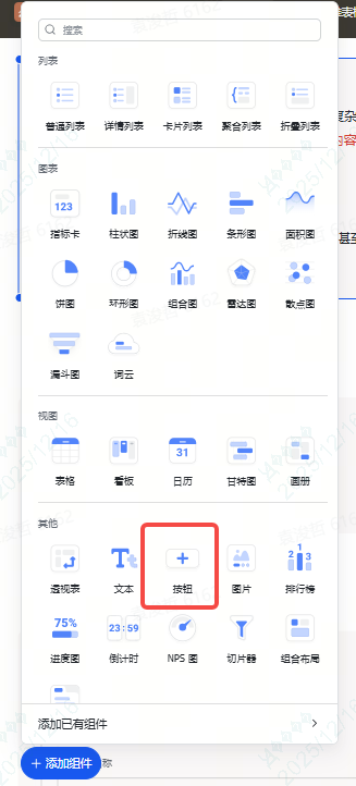 我们点击左下角的“添加组件”,里面有很多组件可以用,我们直接点击,然后组件会自动出现在页面上,我们在页面拖拉拽就可以了,非常方便