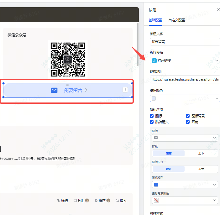 然后我把按钮拖拽到这里,在配置界面,选择点击按钮要执行的操作,比如我这里就是让他打开一个表单链接