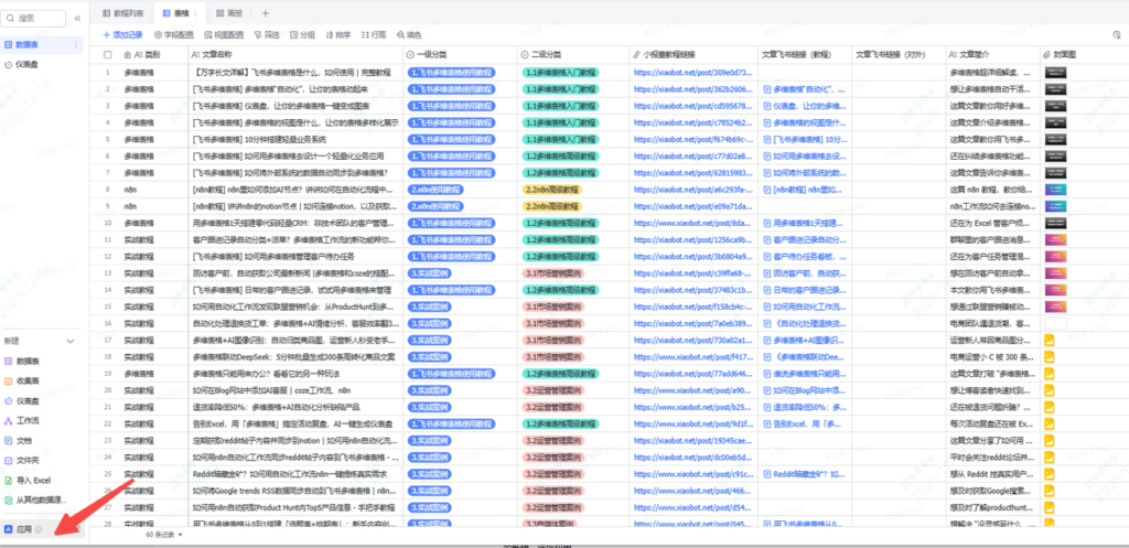 如果你是一个初学者,可以试试直接在多维表格左下角 新建->应用,系统会根据你的数据结构,自动生成一个带有数据的示例应用。这种方式会让我们直接看到结果,省去了从头摸索的过程。
