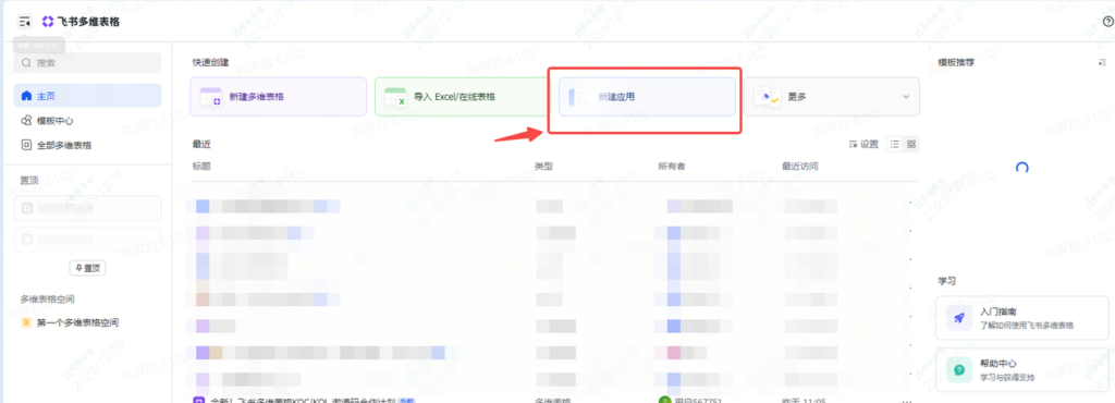 当然,它自己生成的那个,基本都得重头改,因为系统不知道我们的需求,如果我们想直接新建,那就直接在多维表格的主页里,点击新建应用,然后选择空间。