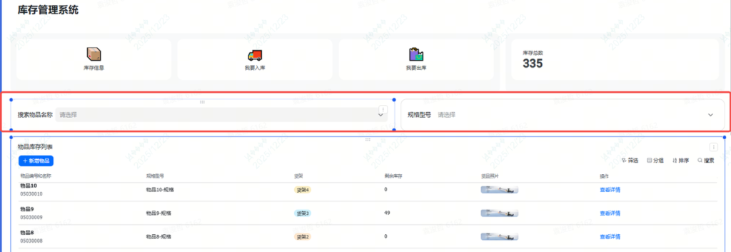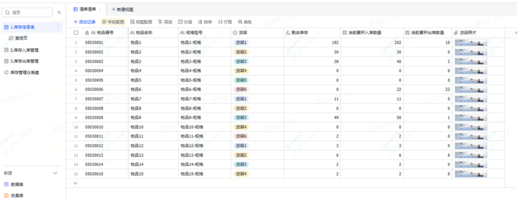 | 库存信息表 | 物品编号(唯一ID)、物品名称、规格型号、剩余库存、货品照片 | 记录物品的“基本信息” |