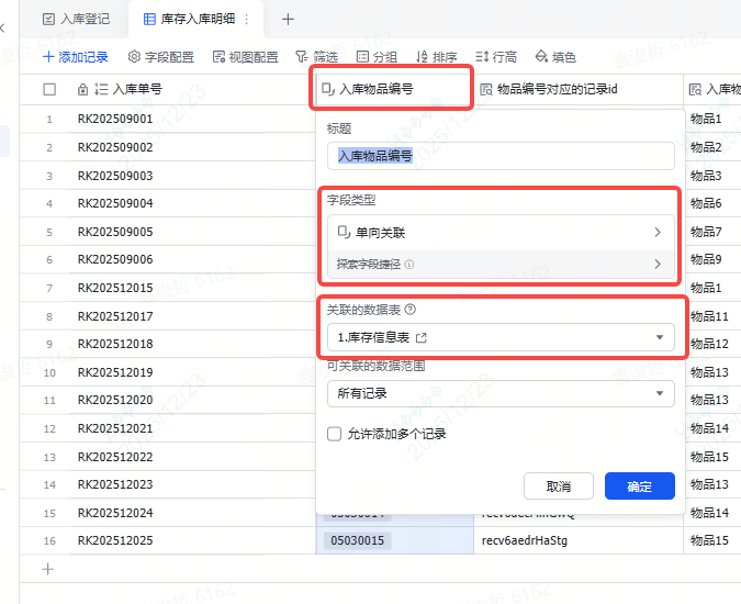 以入库管理为例,入库时,我们需要选择物品编号,这个物品编号的字段,我们选择“单向关联”类型