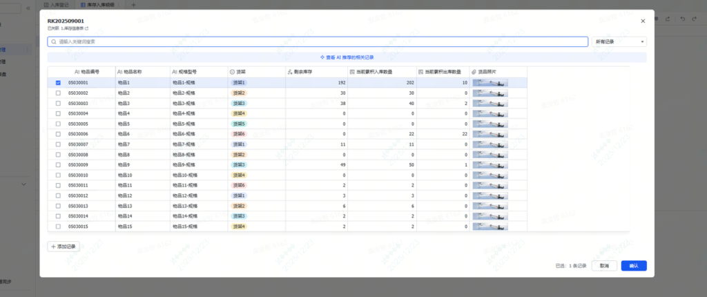 这个时候当我们点击字段,会有一个弹框,这个弹框就是库存信息表里的内容。我们选择需要入库的物品