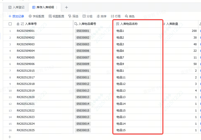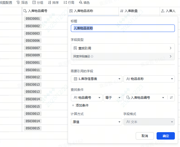 这里就用到“查找引用”的字段类型。简单来说,就是通过我选择的物品编号,自动把对应的物品名称带出来展示即可。