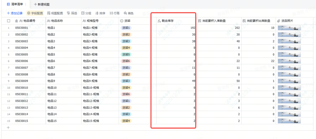 剩余库存的计算逻辑很简单,实际上就是这个表里的“当前累积入库数量 – 当前累积出库数量”