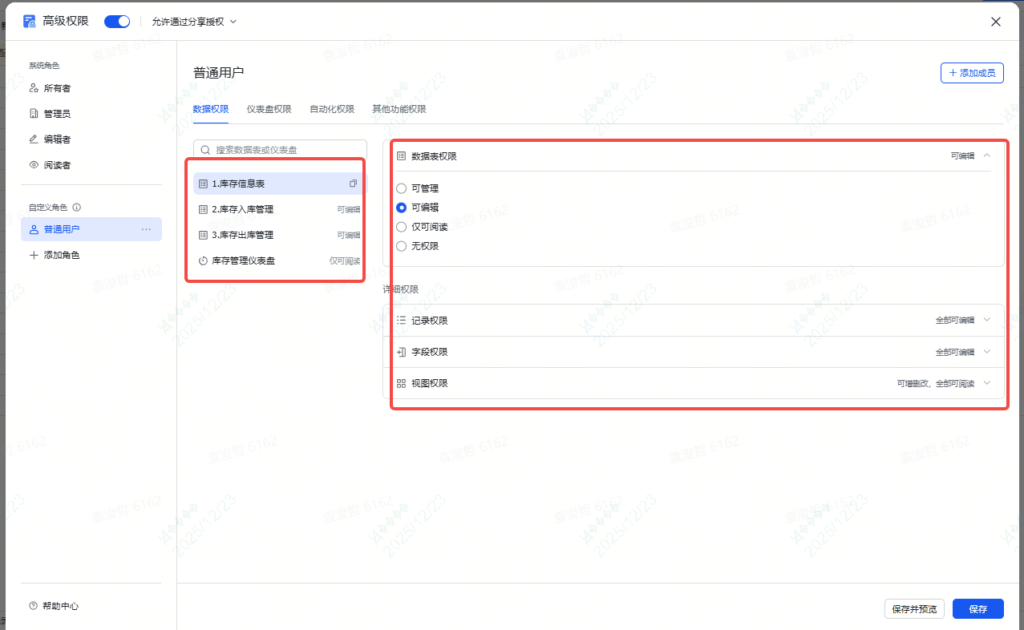 在高级权限中,我们可以设置不同角色,以及每个角色拥有的表格权限,数据权限,和字段权限