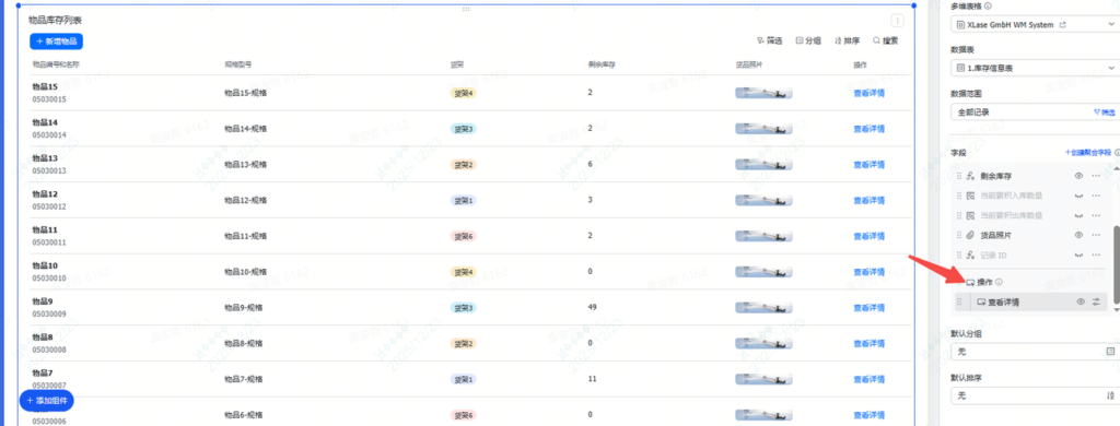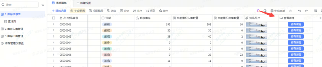 - 查看详情:首先我们要先去多维表格底表上,增加一个查看详情的按钮