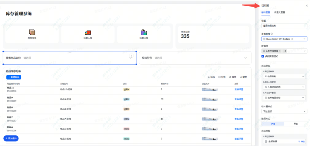 这里就需要用到切片器的组件,选择搜索的范围、字段和样式